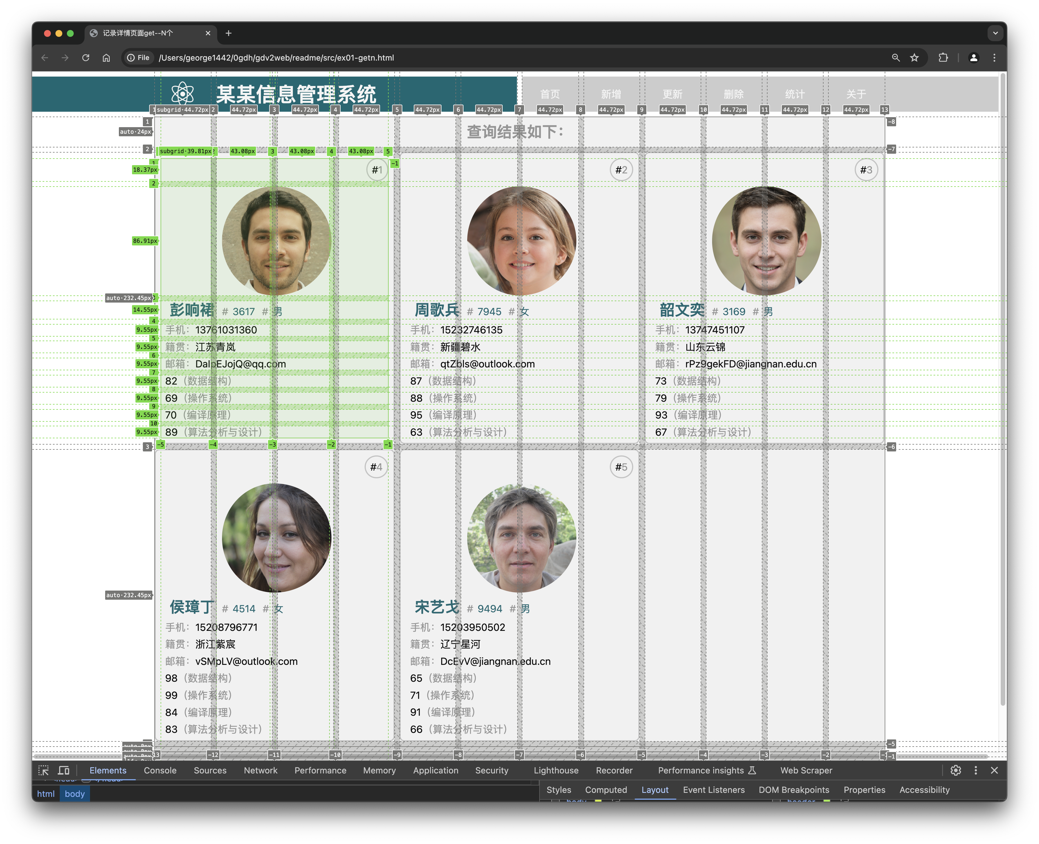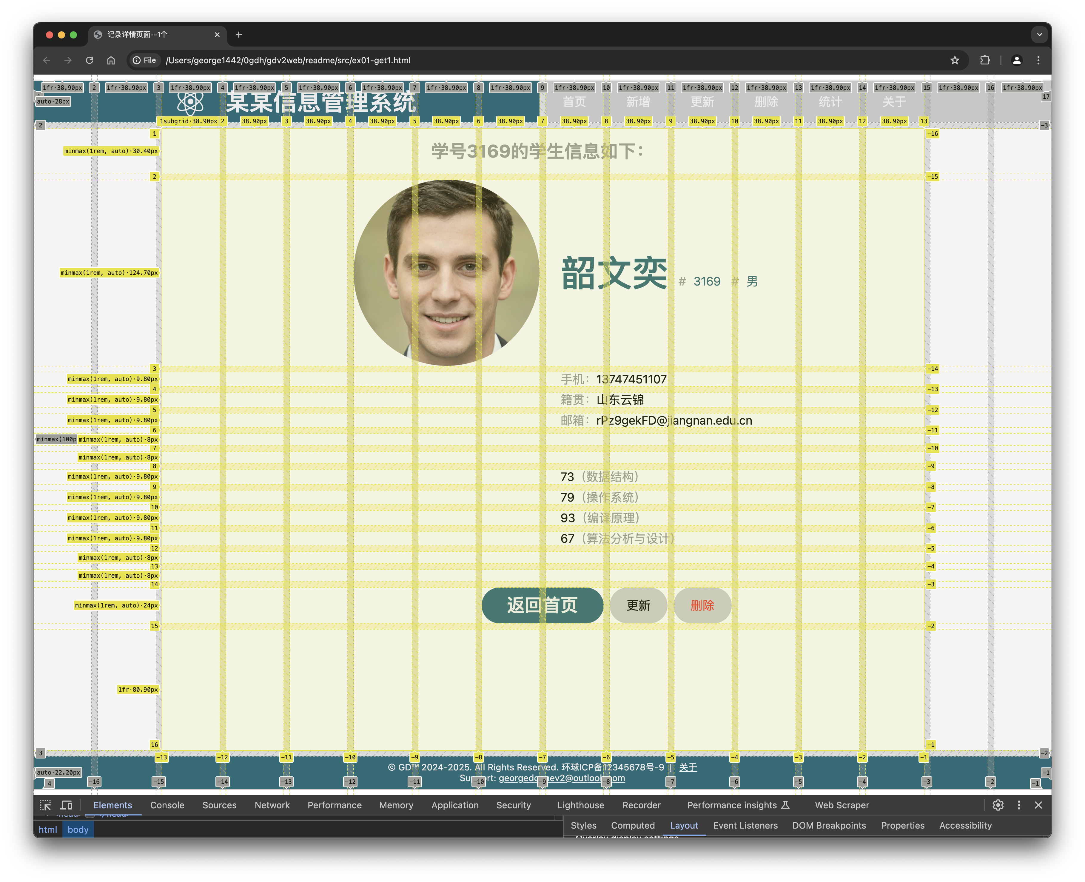 参考查询得到多个记录的显示界面,当前界面的css还是相对好理解的。以下截图中,灰色网格线是body的网格grid布局,黄色网格线是主内容 #main-get 的网格线。