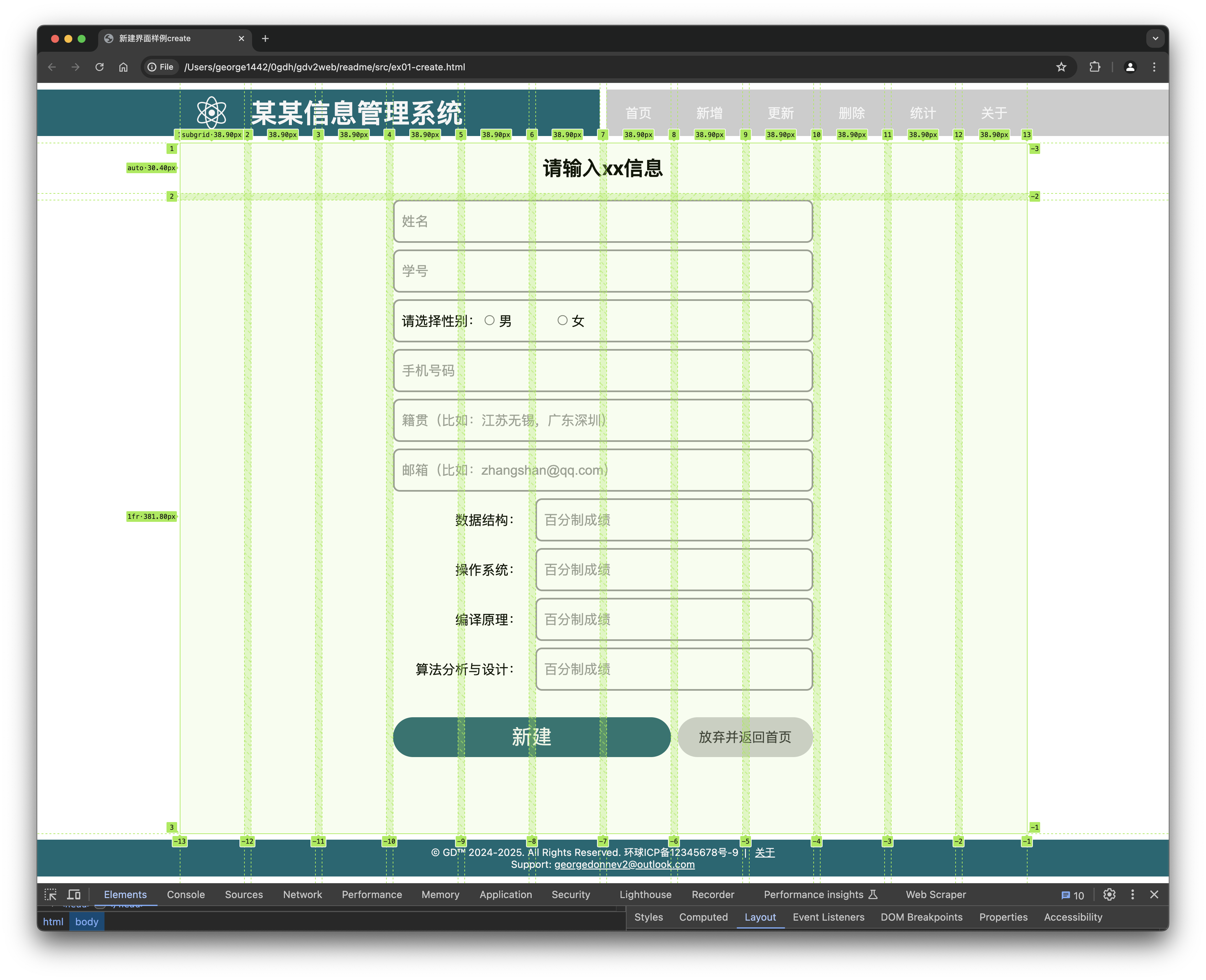 - 表单form也是采用网格grid布局,是主内容 #main-create 的子网格。表单form跨12列。其中姓名、学号、手机号码、籍贯、邮箱等,都是放置在第3列、跨6列。采用了不同类型type的输入框input,包括 number、text、email等。