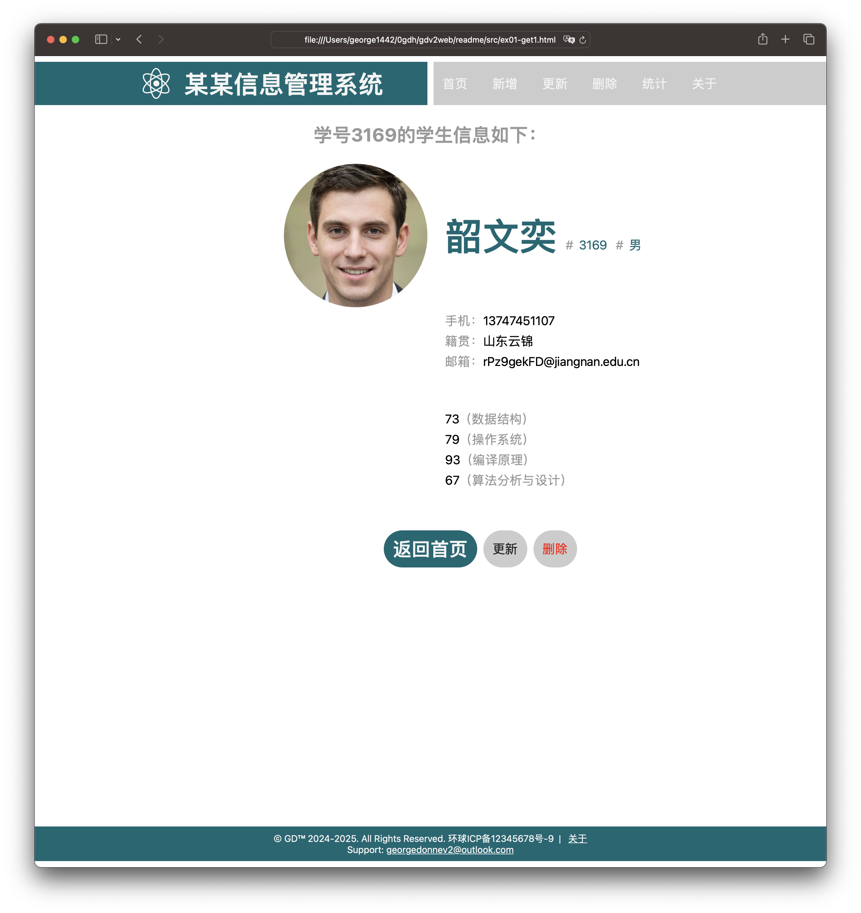 - 多个记录的页面,可用于:(1)查询所有记录;(2)或者查询姓名中的1个字;(3)……。按学号查询应该最多得到一条记录,相关页面请参考本文相关章节。
