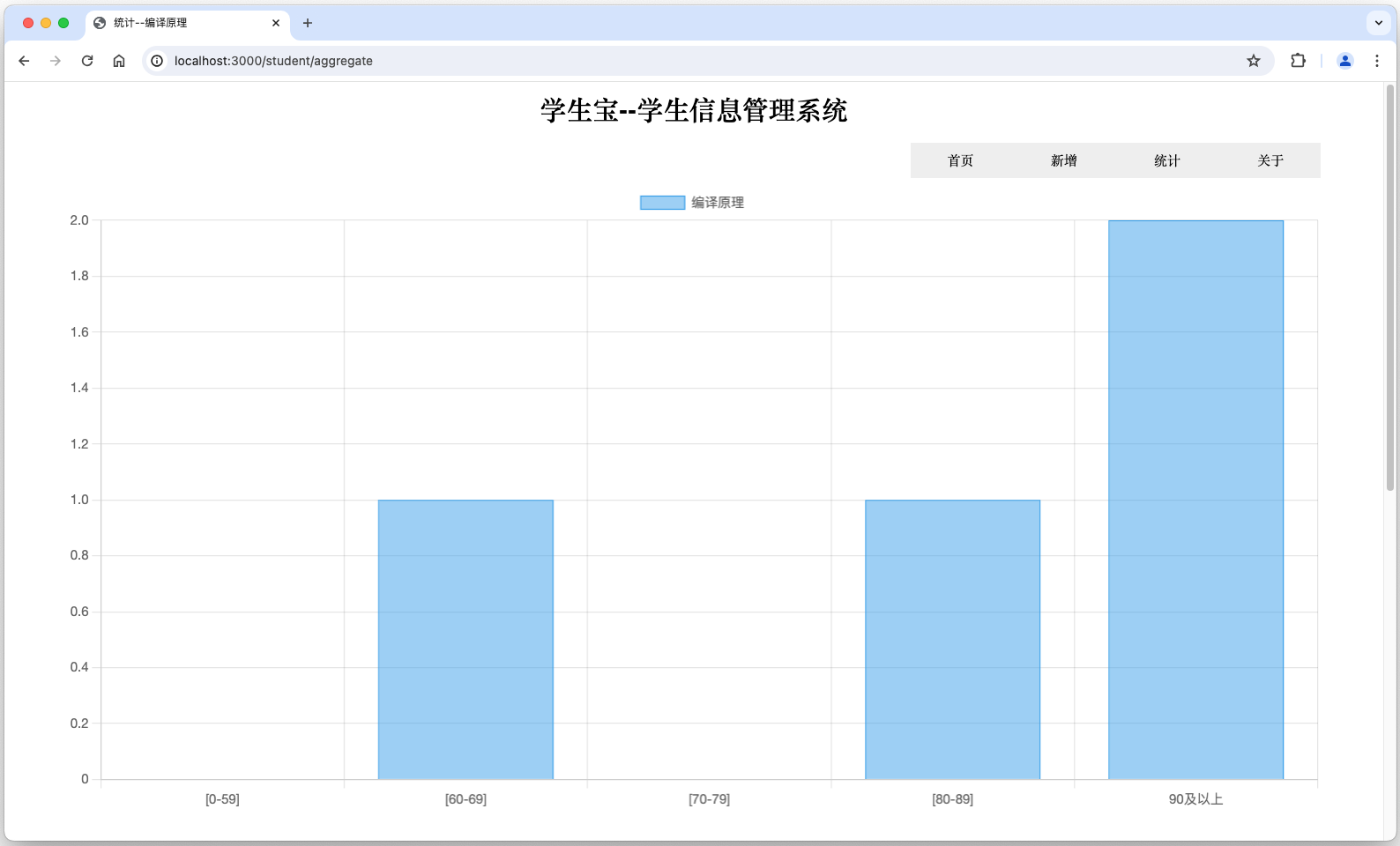 信息管理系统通常还需要统计功能,并将统计结果显示为图表(比如柱状图)。以下以统计成绩段为例,比如60分以下、60-70分、70-80分、80-90分、90-100分的成绩有多少,并显示为柱状图。