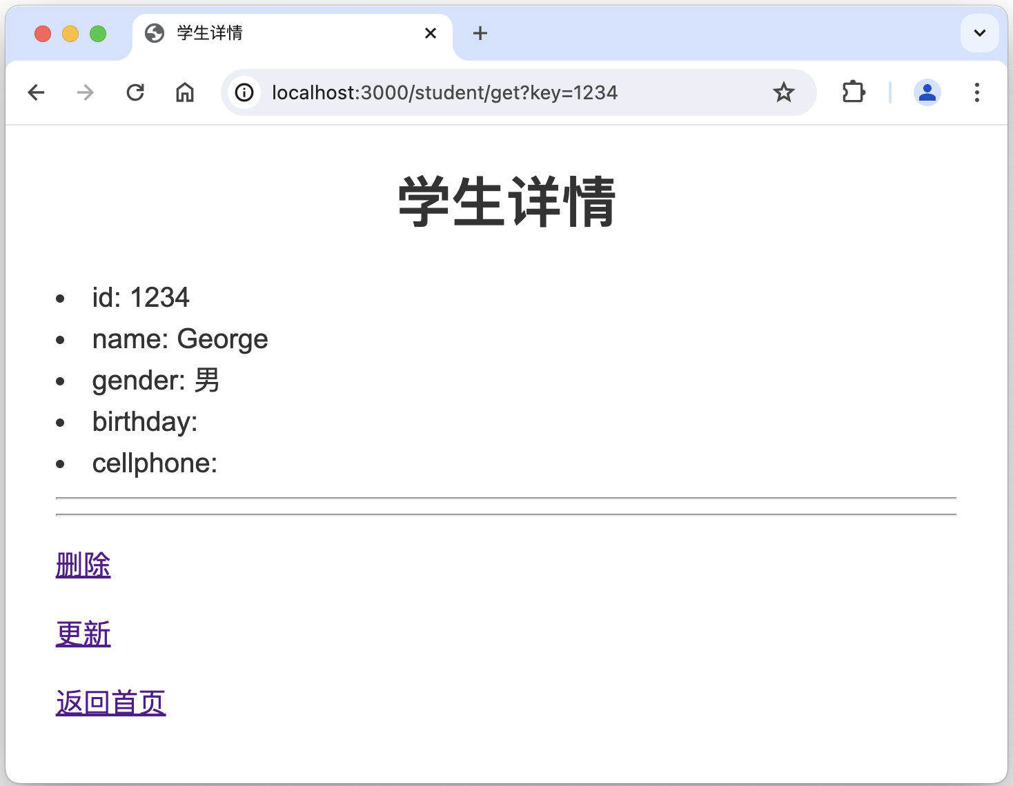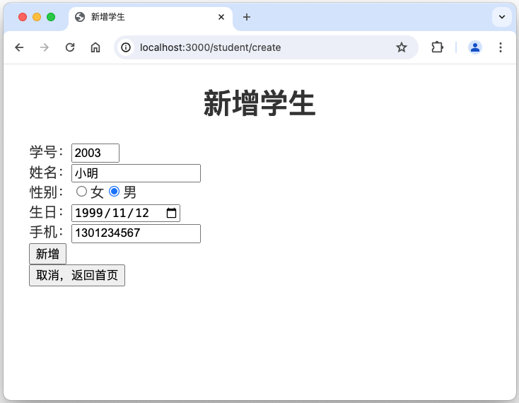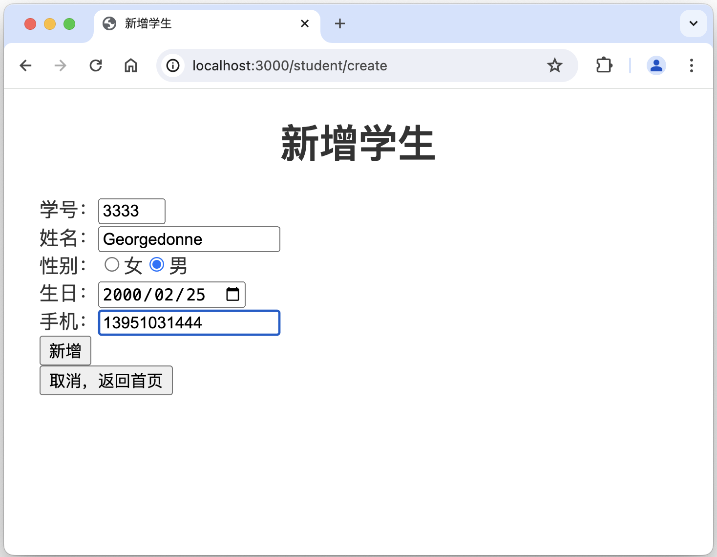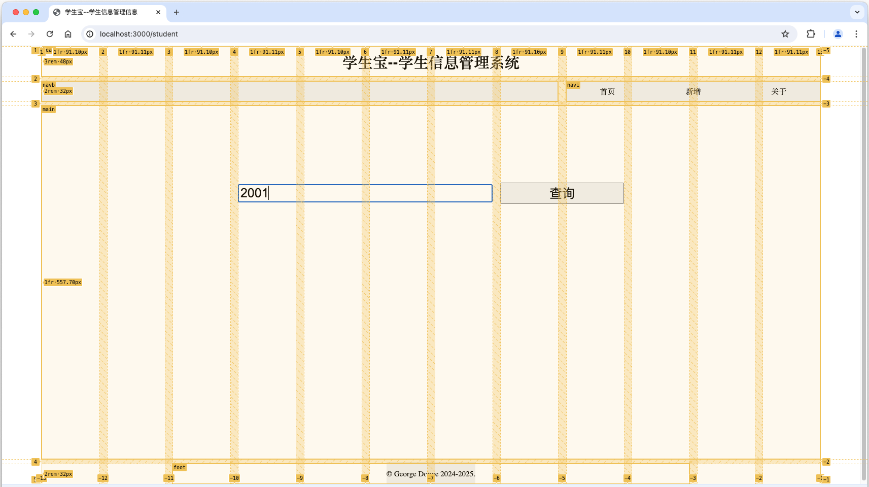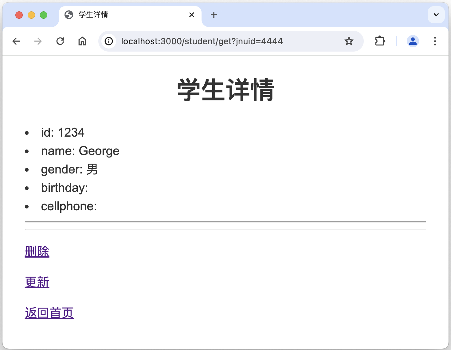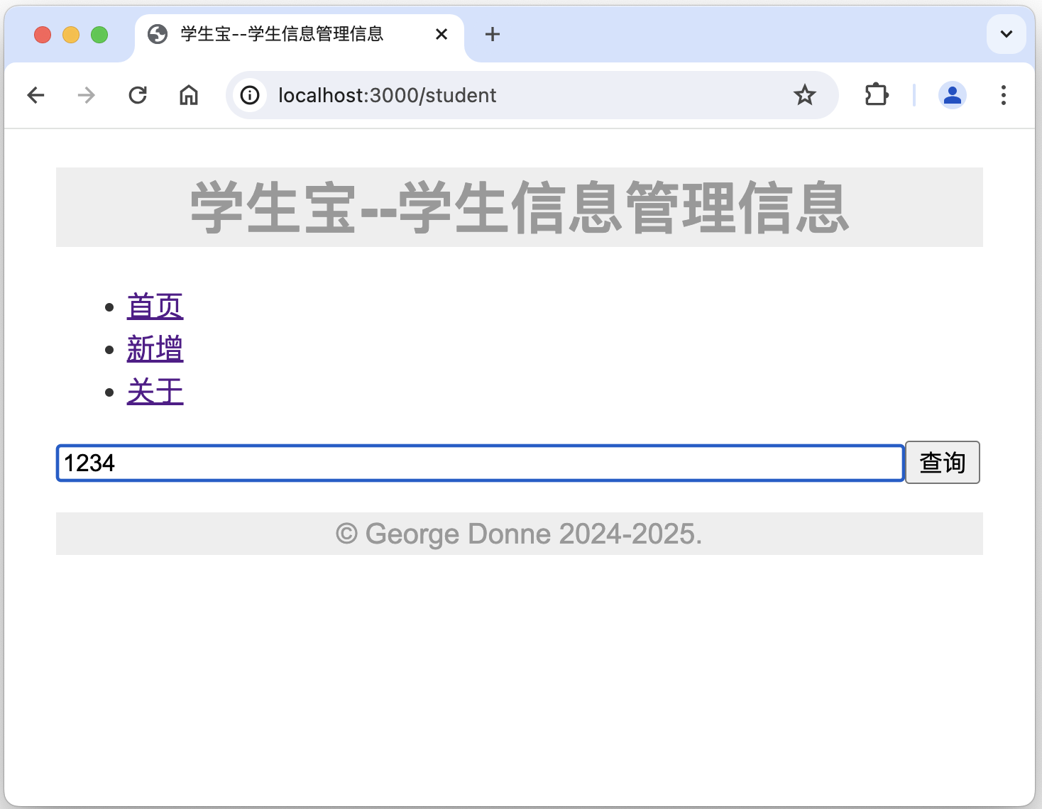 <!-- 导航栏有3个链接,点击后分别跳转到相应页面。比如点击 [新增] 后,跳转到 /student/get 页面。此处 # 表示跳转到本页面,仅供演示用。 -->
