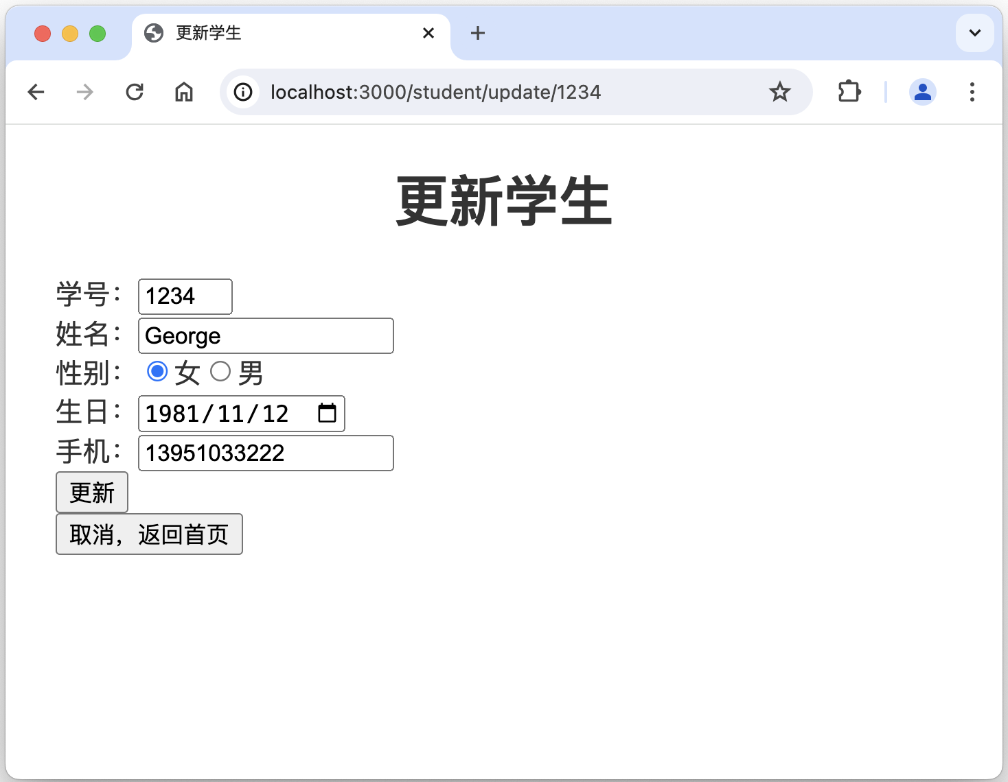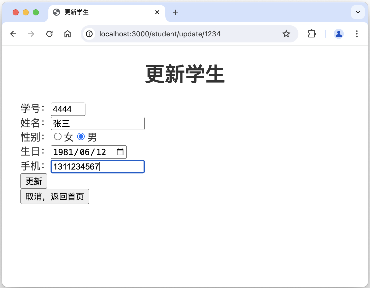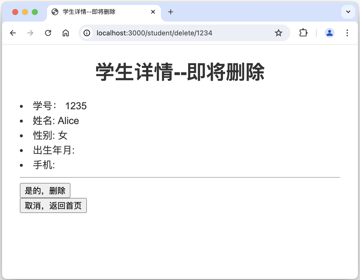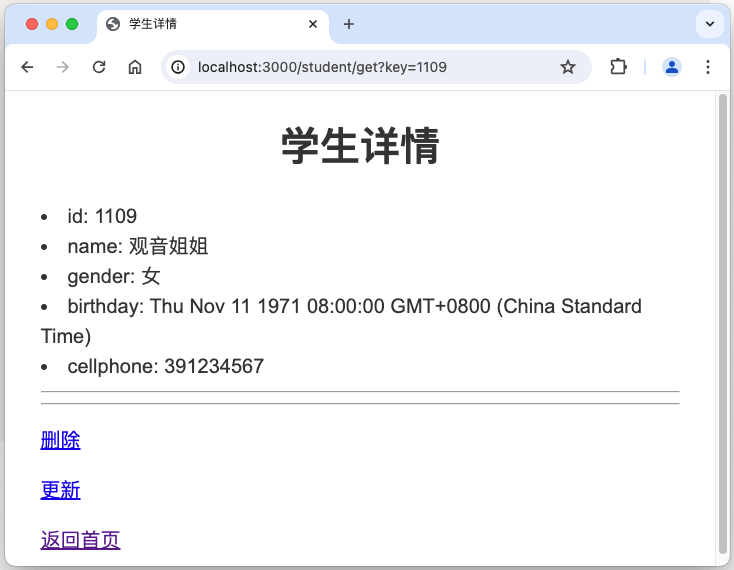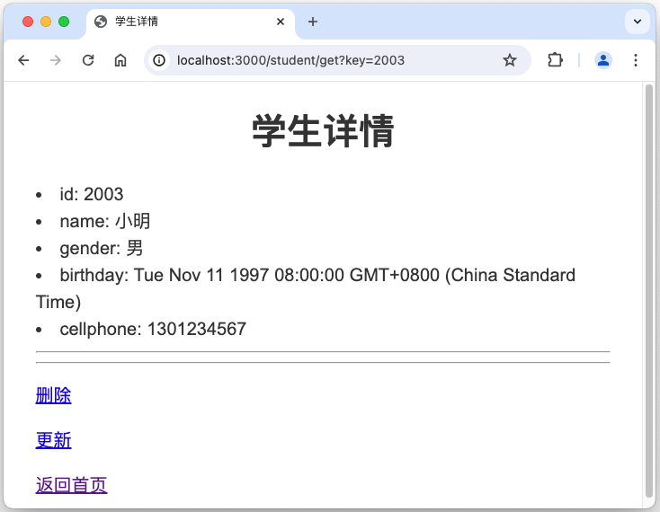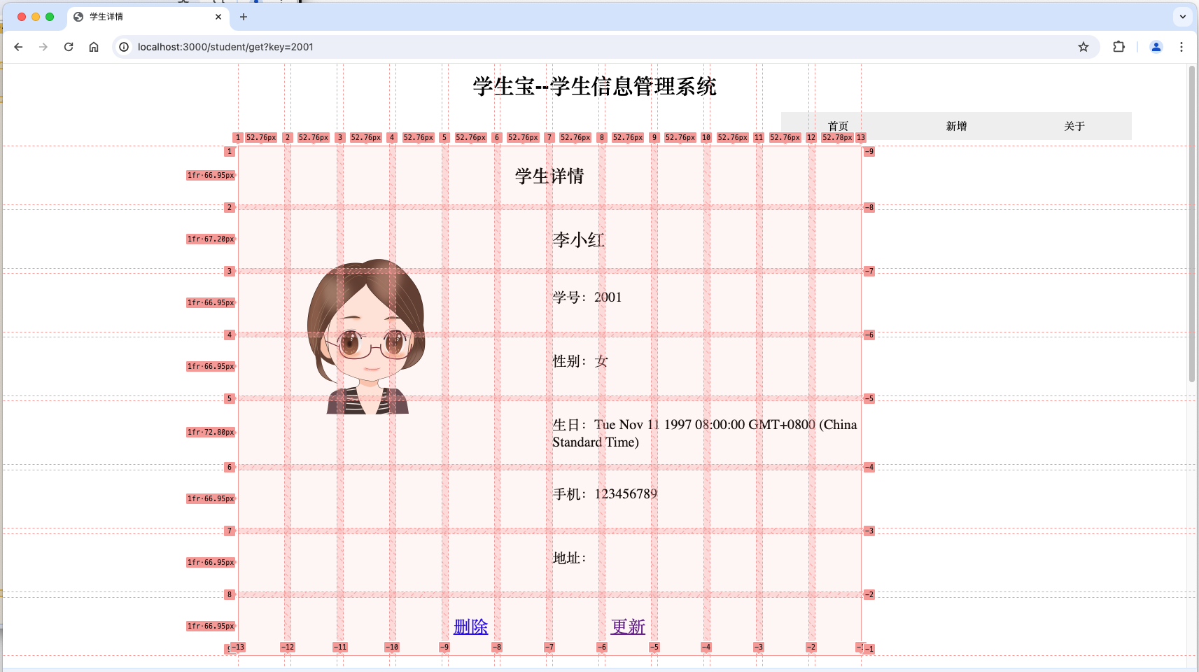 <!-- 导航栏有3个链接,点击后分别跳转到相应页面。比如点击 [新增] 后,跳转到 /student/get 页面。此处 # 表示跳转到本页面,仅供演示用。 -->